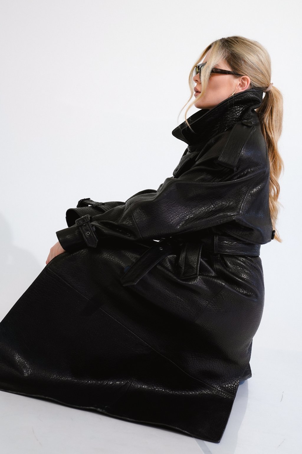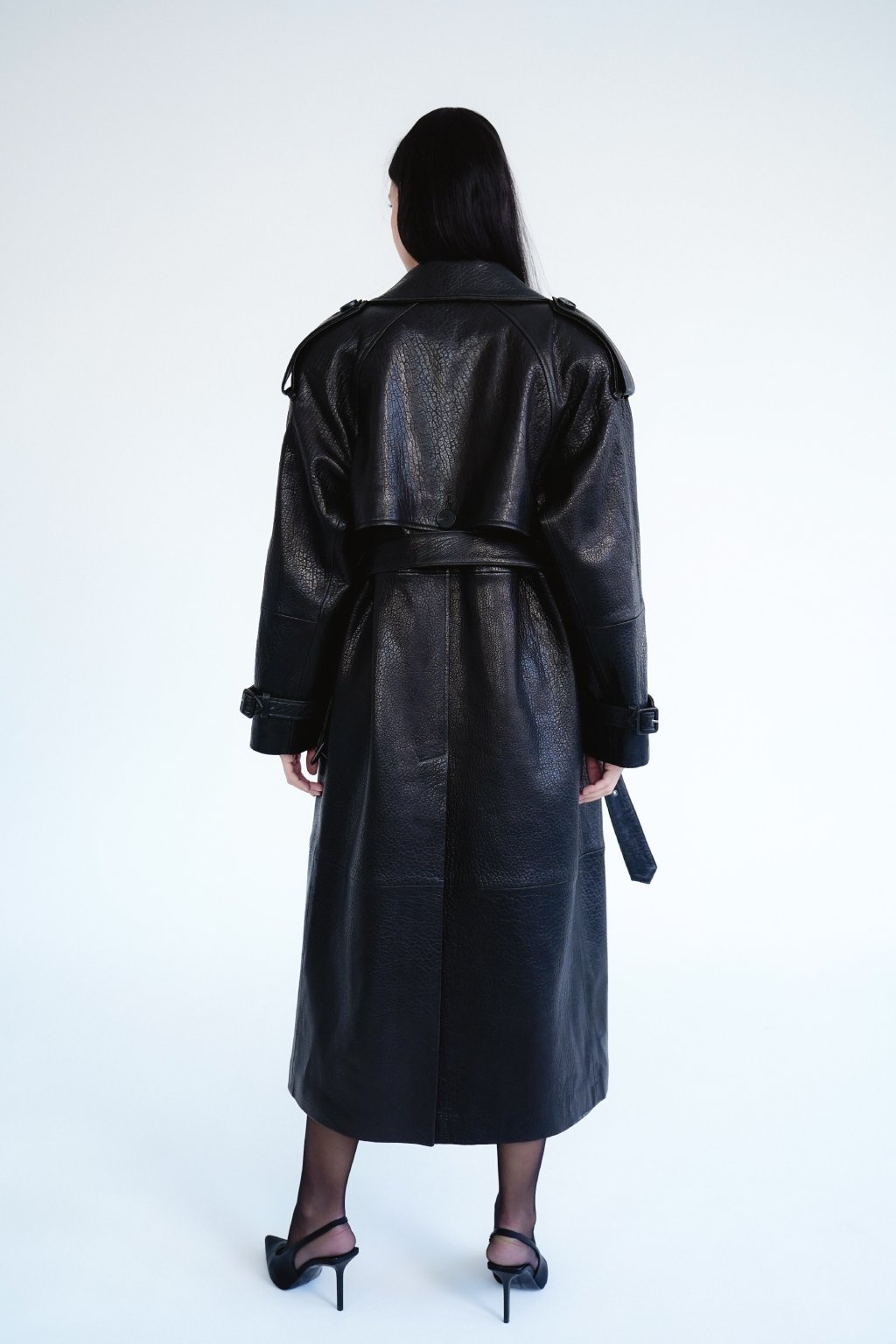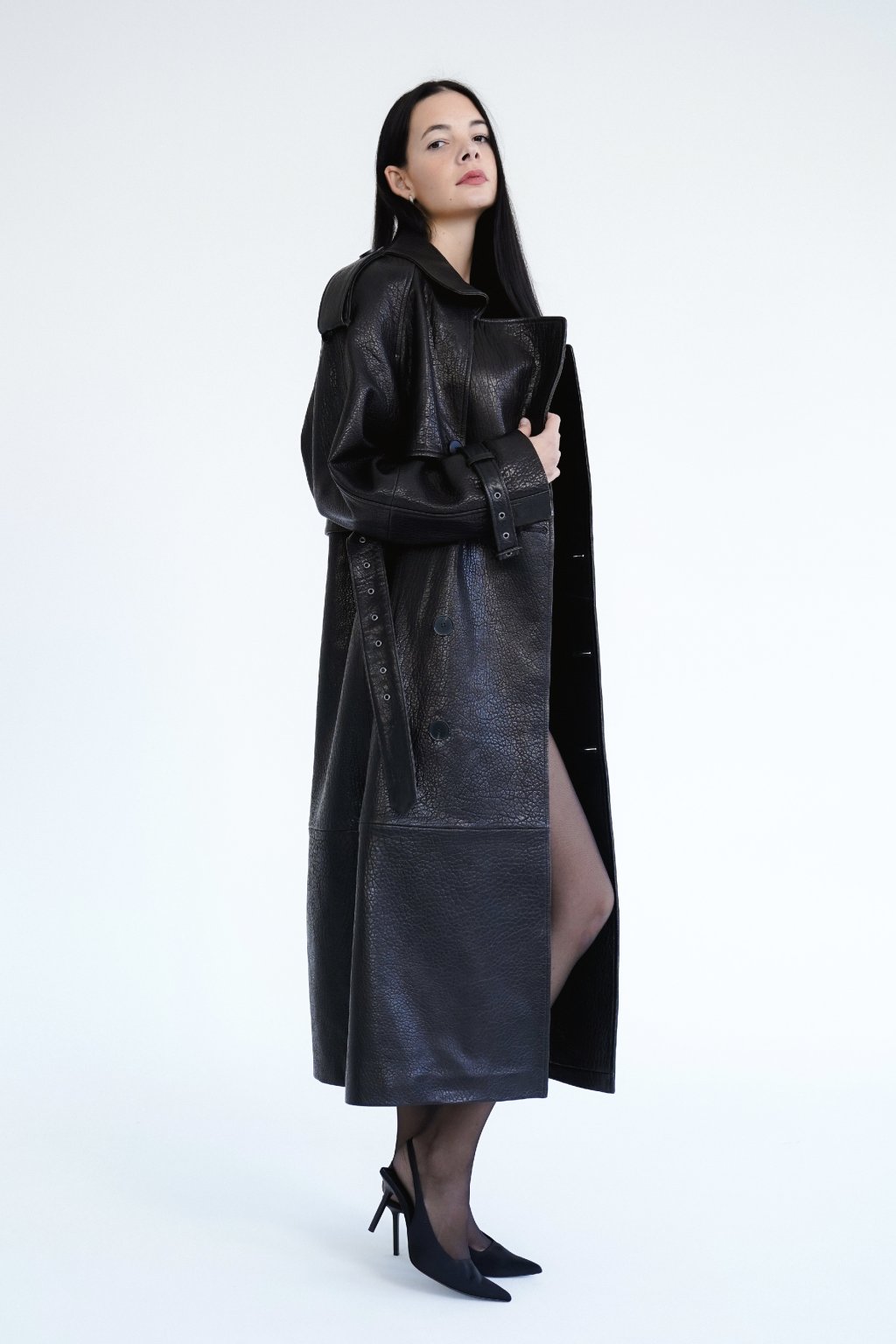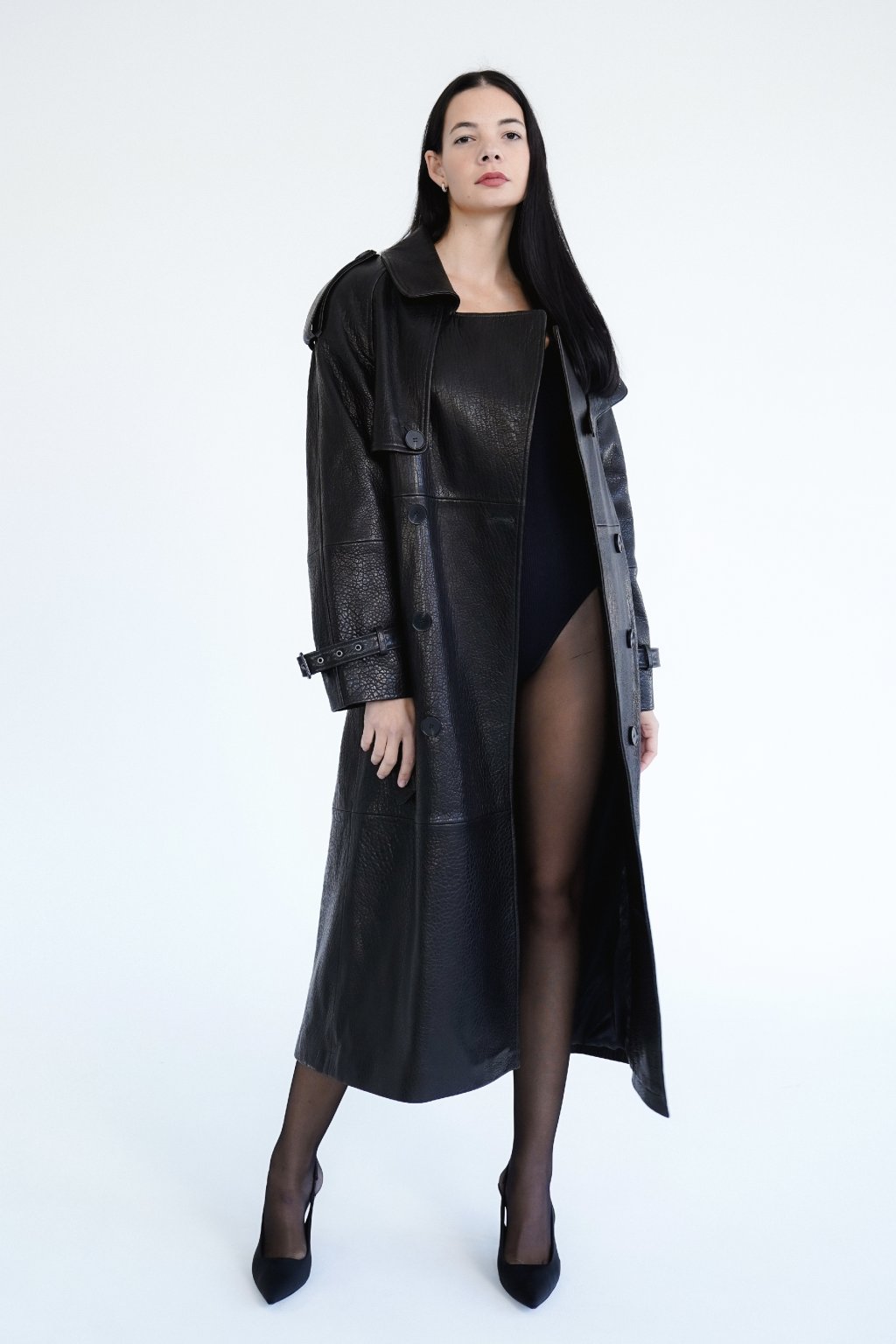 Discover an iconic trench coat that combines timeless elegance with modern sophistication. This luxurious coat is crafted from textured genuine leather in black shade for a unique texture and unmistakable character.