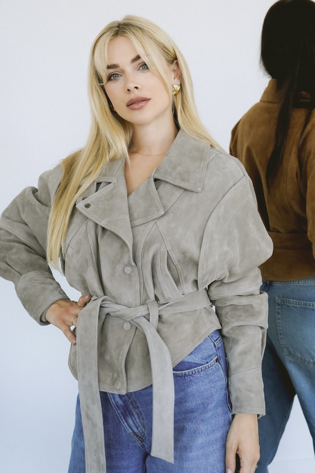 Frame is an iconic piece that frames the figure. A suede jacket with a belt to shape the silhouette according to your mood.