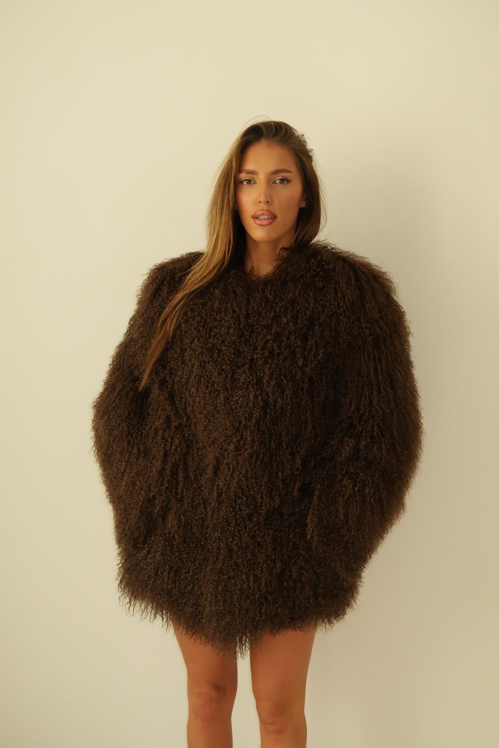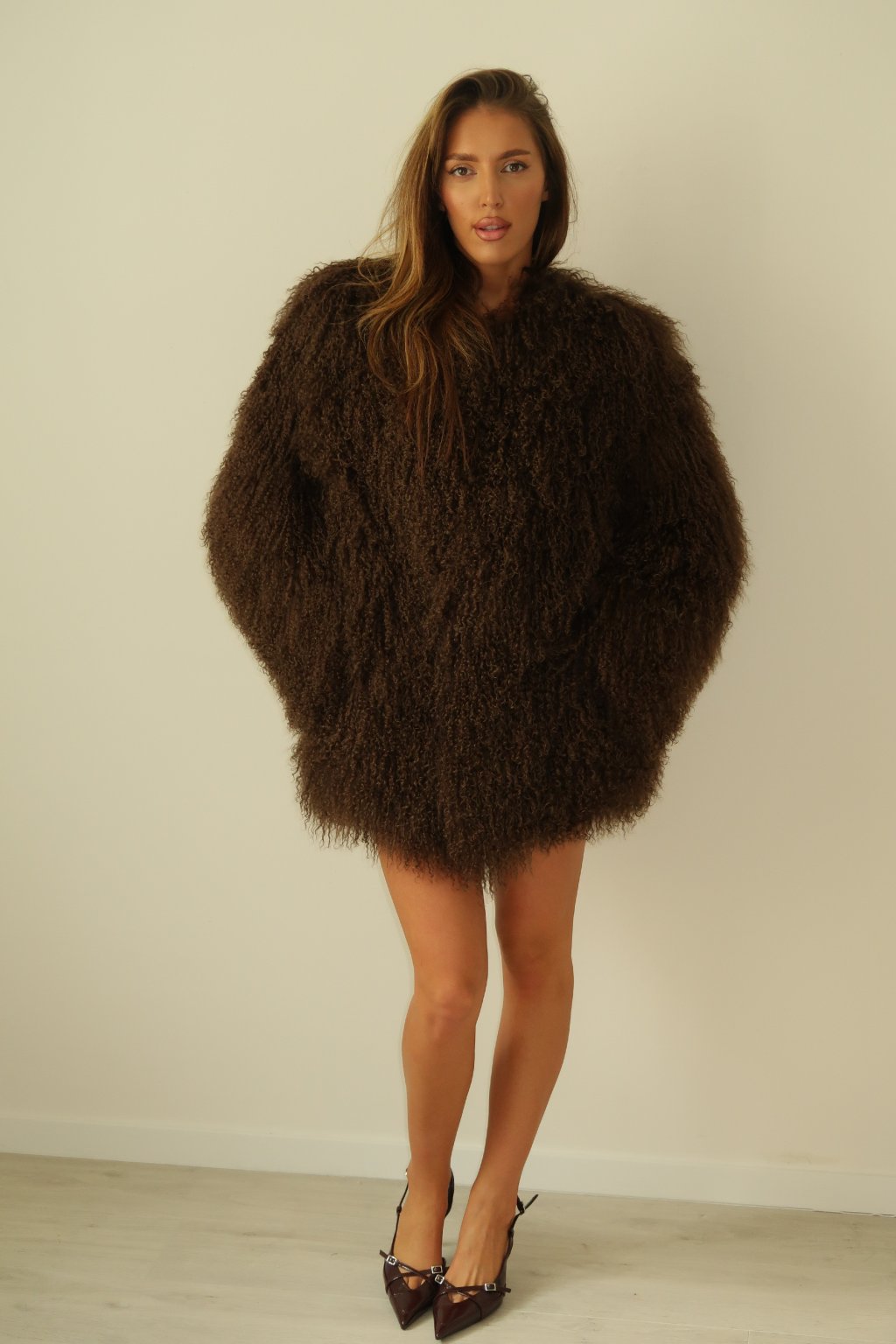 Women's shaggy fur coat made of genuine sheepskin in chocolate color.