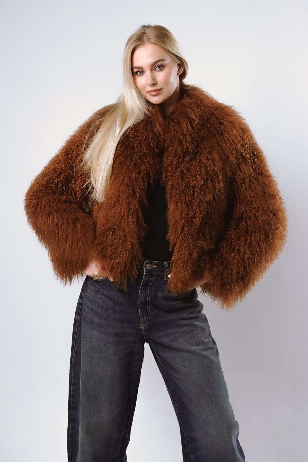 Women's stylish fur coat made of genuine Mongolian sheep fur. The coat has a stand-up collar, hook-and-loop closure, two side pockets and longer sleeves.