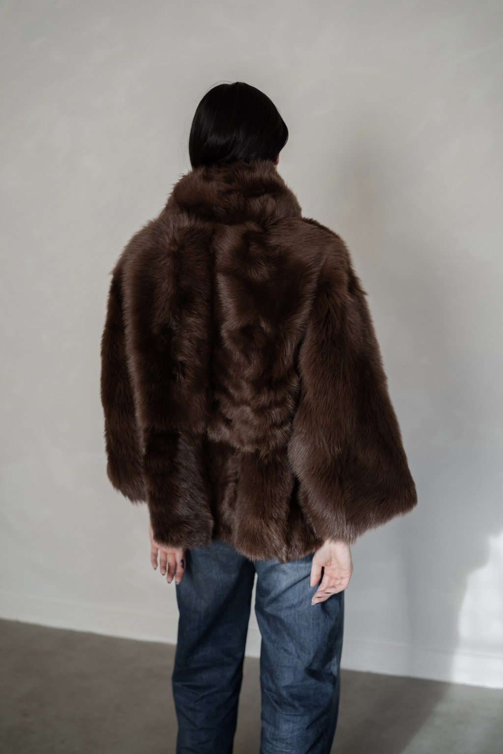 This luxurious jacket made of genuine Tuscan sheepskin in an elegant walnut shade is a statement piece that will instantly elevate any outfit. The jacket has a high collar, cropped wide sleeves and a snap closure.
