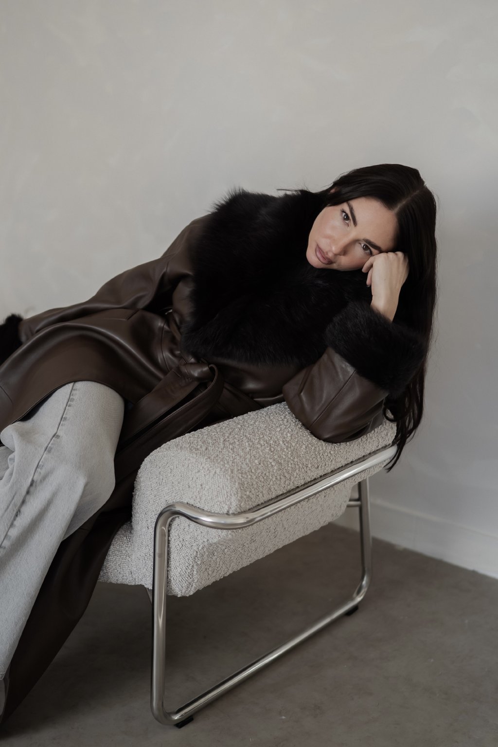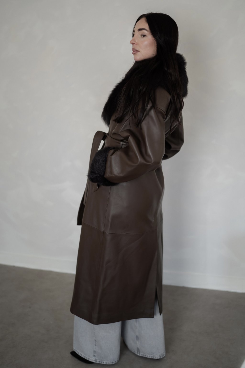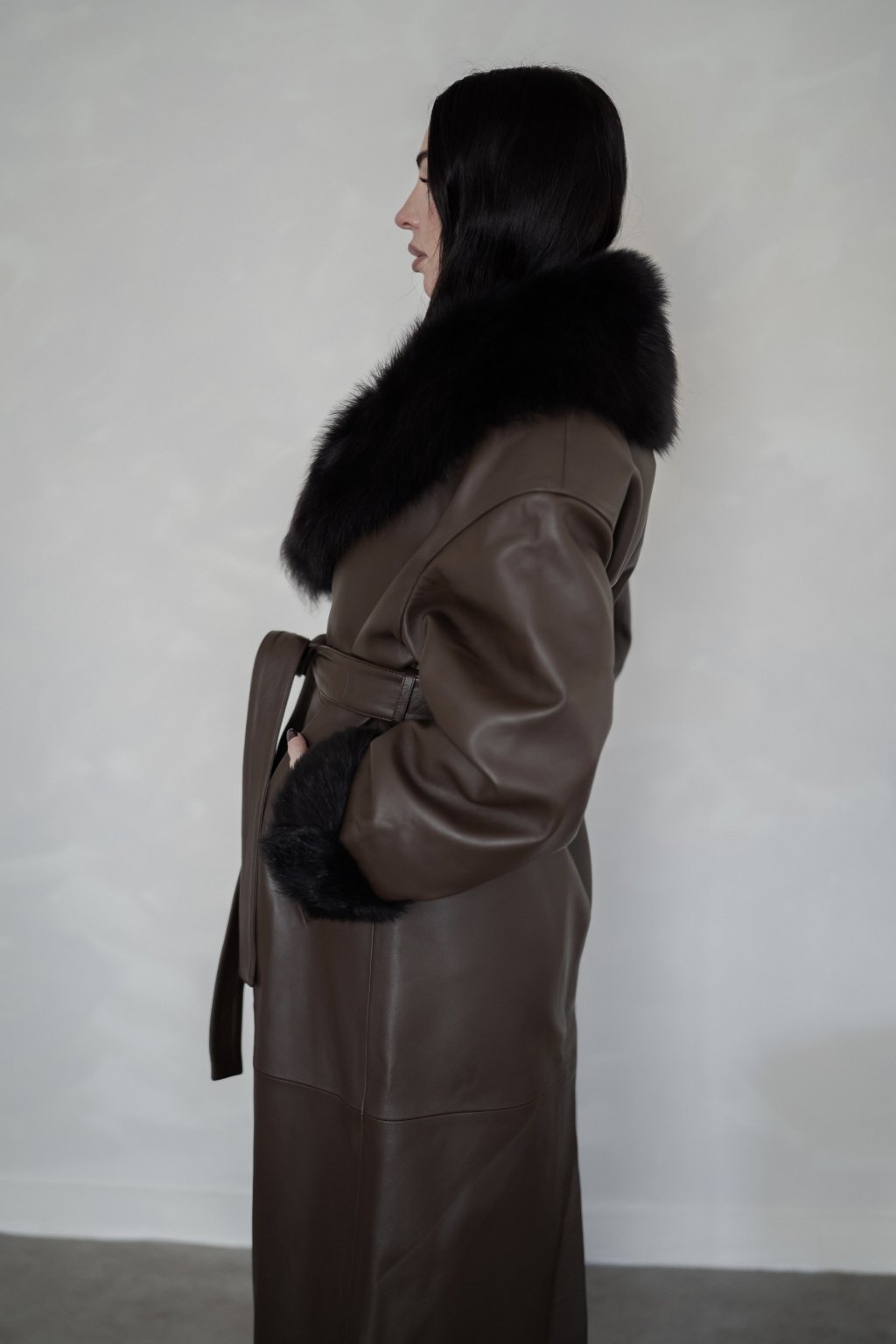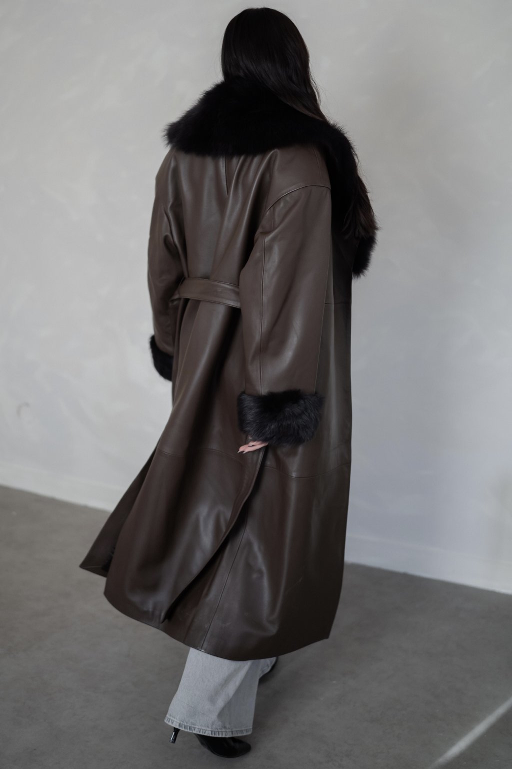 Minimalistická silueta, precizní zpracování a hebká struktura kůže vytváří kabát, který působí luxusně, ale přirozeně.