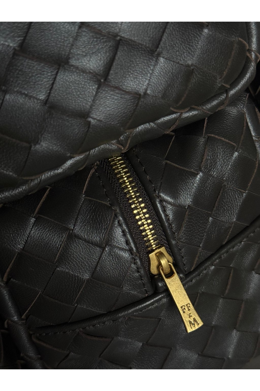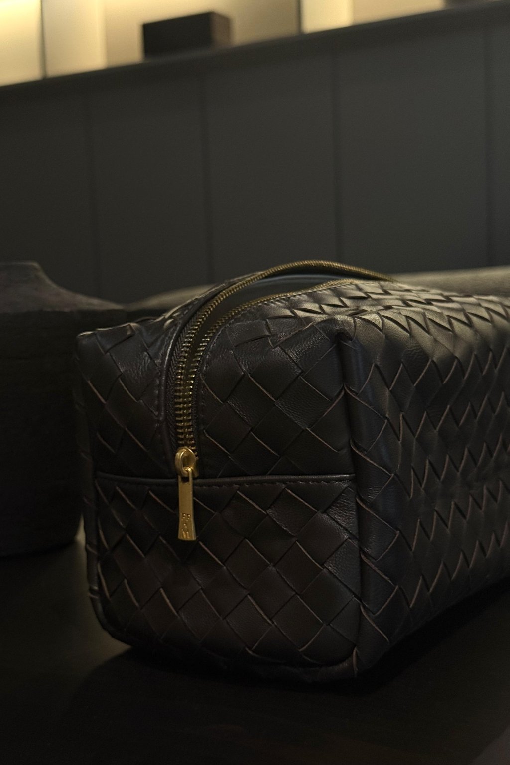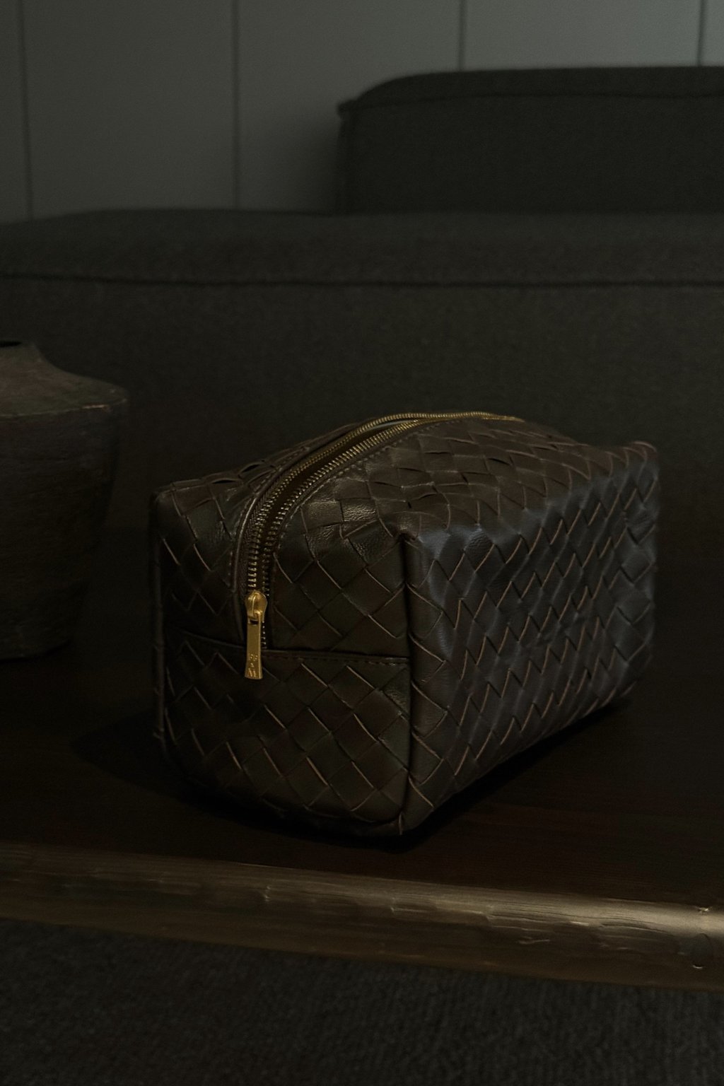 Měkká, precizně pletená jehněčí kůže v čokoládovém odstínu dodává pouchi luxusní vzhled i příjemný pocit na dotek. Zlatý matný kovový zip podtrhuje elegantní charakter a zajišťuje bezpečné uzavření.