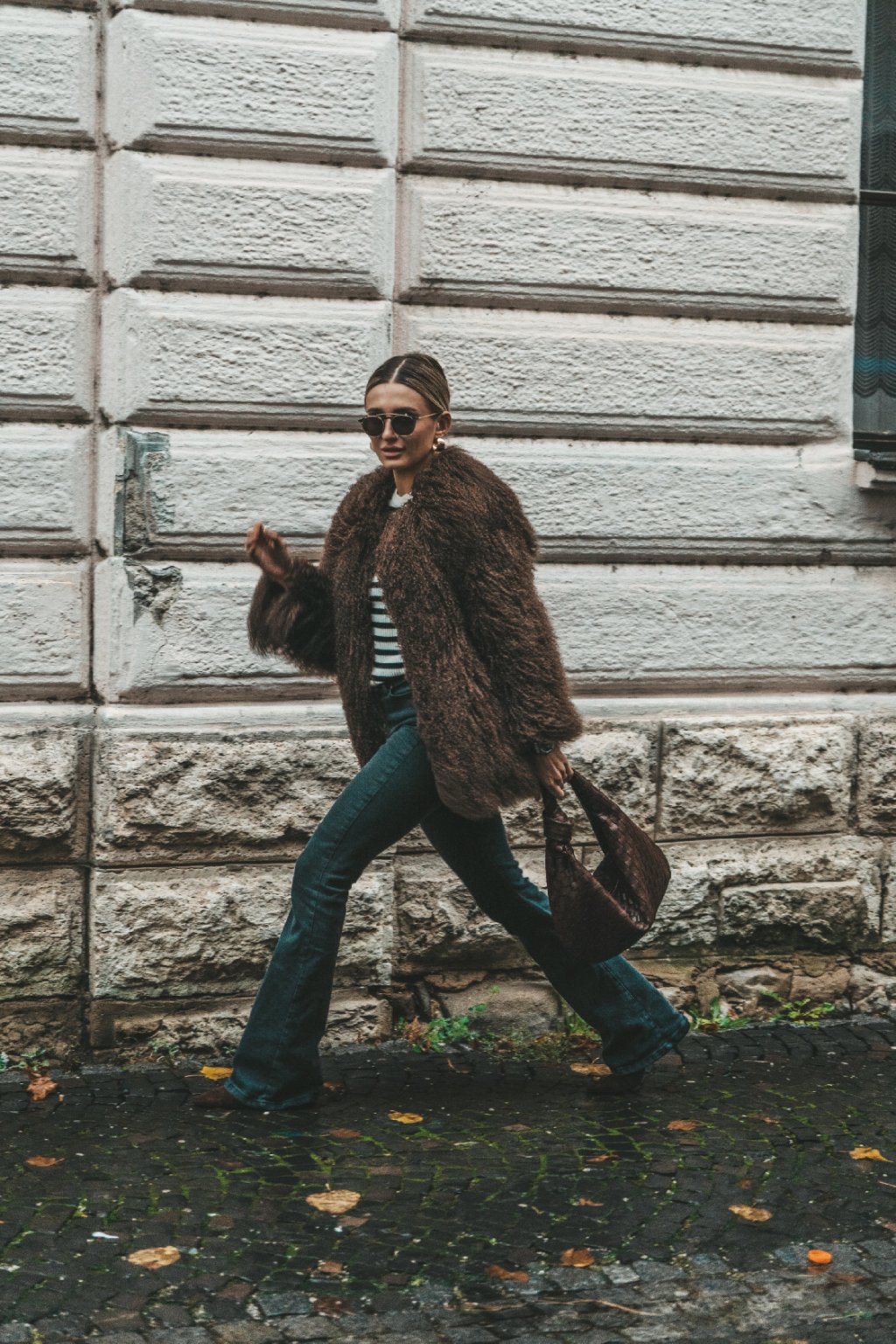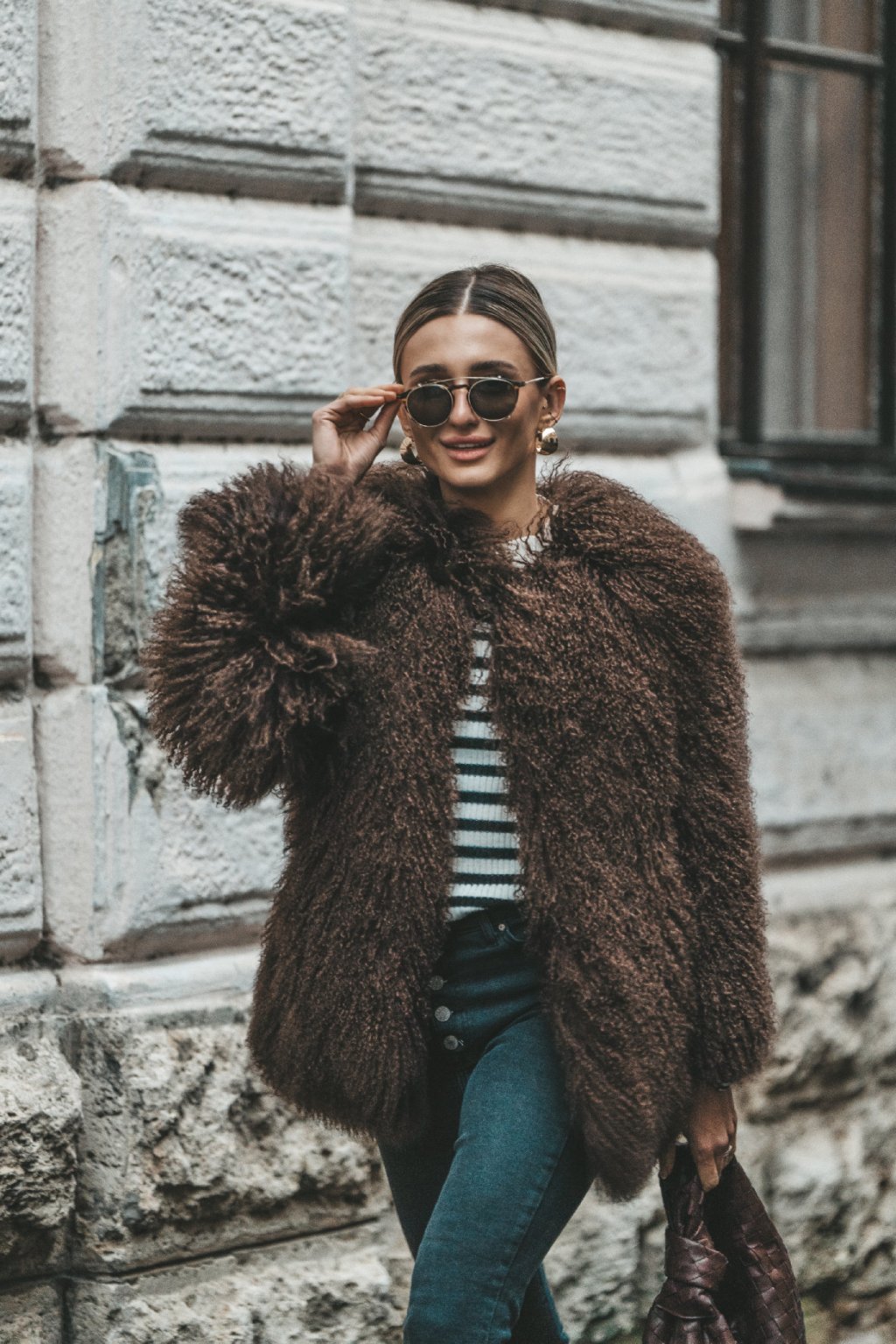 Dámský huňatý kožíšek z pravé ovčí kožešiny v čokoládové barvě.