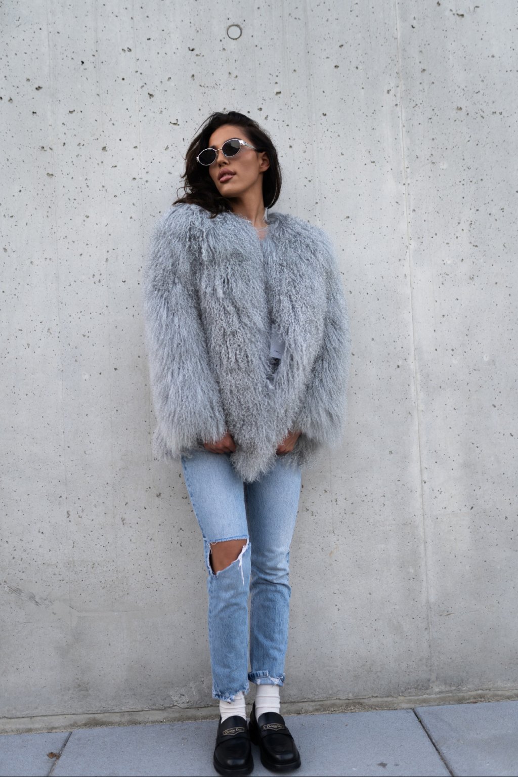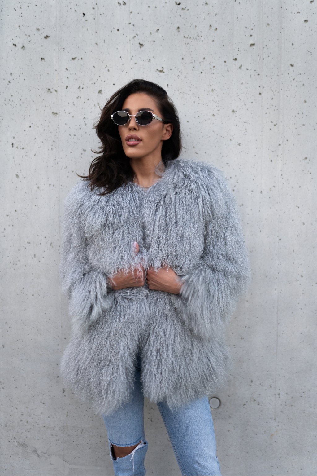 Dámský huňatý kožíšek z pravé ovčí kožešiny ve světle šedém provedení.