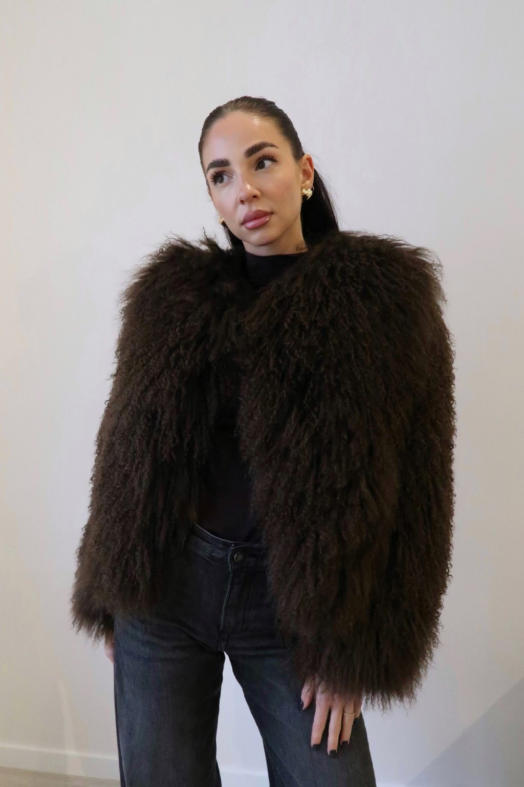 Dámský stylový kožich do pasu z pravé ovčí kožešiny z mongolské ovce. Kožich má podšívku, dlouhé rukávy k zápěstí, zapínání na háčky a dvě boční kapsy.